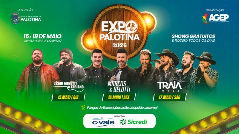 A abertura da Expo Palotina será marcada por um grande show da renomada dupla Cesar Menotti & Fabiano, no dia 15 de maio. Já no dia 16, o palco será dos artistas Marcos & Belutti, e no sábado, 17, a animação ficará por conta da banda Traia Véia.
