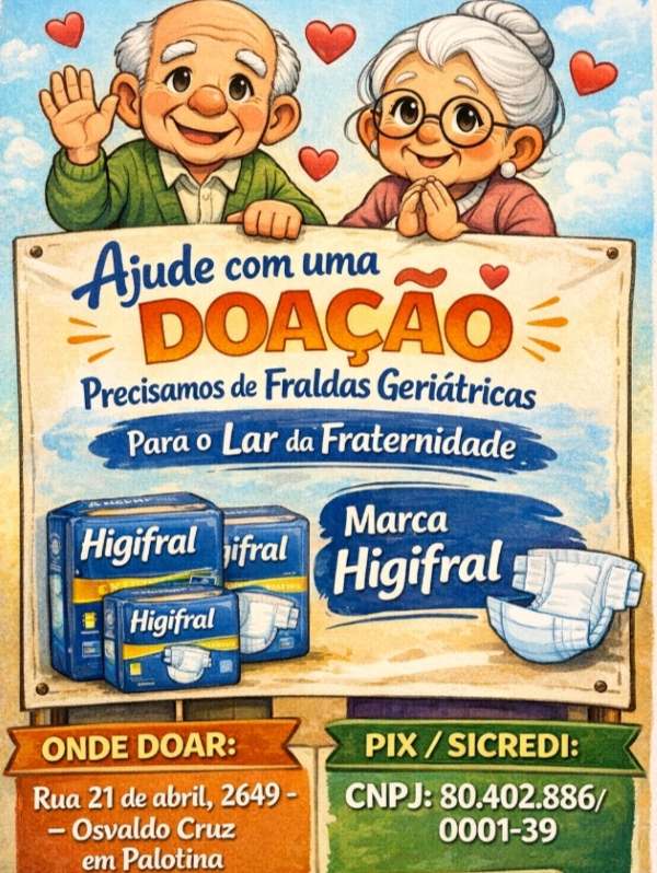 Uma campanha solidária está mobilizando a comunidade de Palotina para ajudar o Lar da Fraternidade, instituição que atende idosos no município. A ação tem como objetivo arrecadar fraldas geriátricas da marca Higifral, item essencial para o cuidado diário dos residentes.