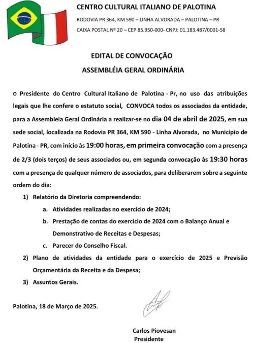 O Presidente do Centro Cultural Italiano Sr. Carlos Piovesan, convoca os associados, para a Assembleia Geral Ordinária, que será realizada no dia (04) de abril (sexta-feira), as ‘19:00horas, em sua sede social, localizado na Rodovia PR 364, KM 590 –Linha Alvorada no Município de Palotina Paraná.