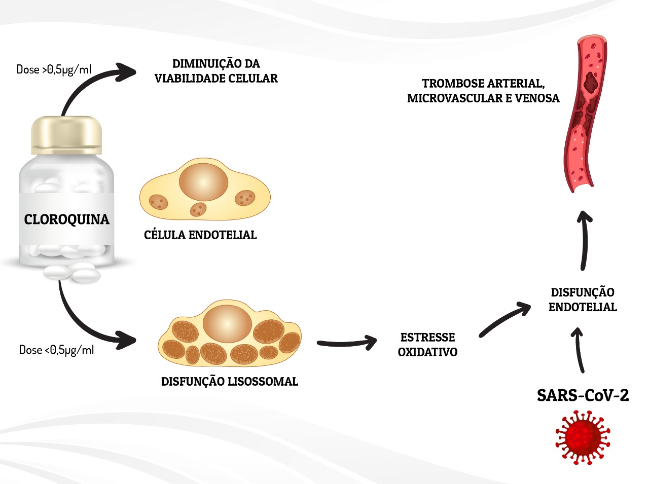 Para chegar a essa comprovação, o pesquisador trabalhou com linhagens de células endoteliais humanas extraídas de vasos sanguíneos, que foram cultivadas na presença de cloroquina, em concentrações incapazes de causar sua morte celular, por até 72 horas.