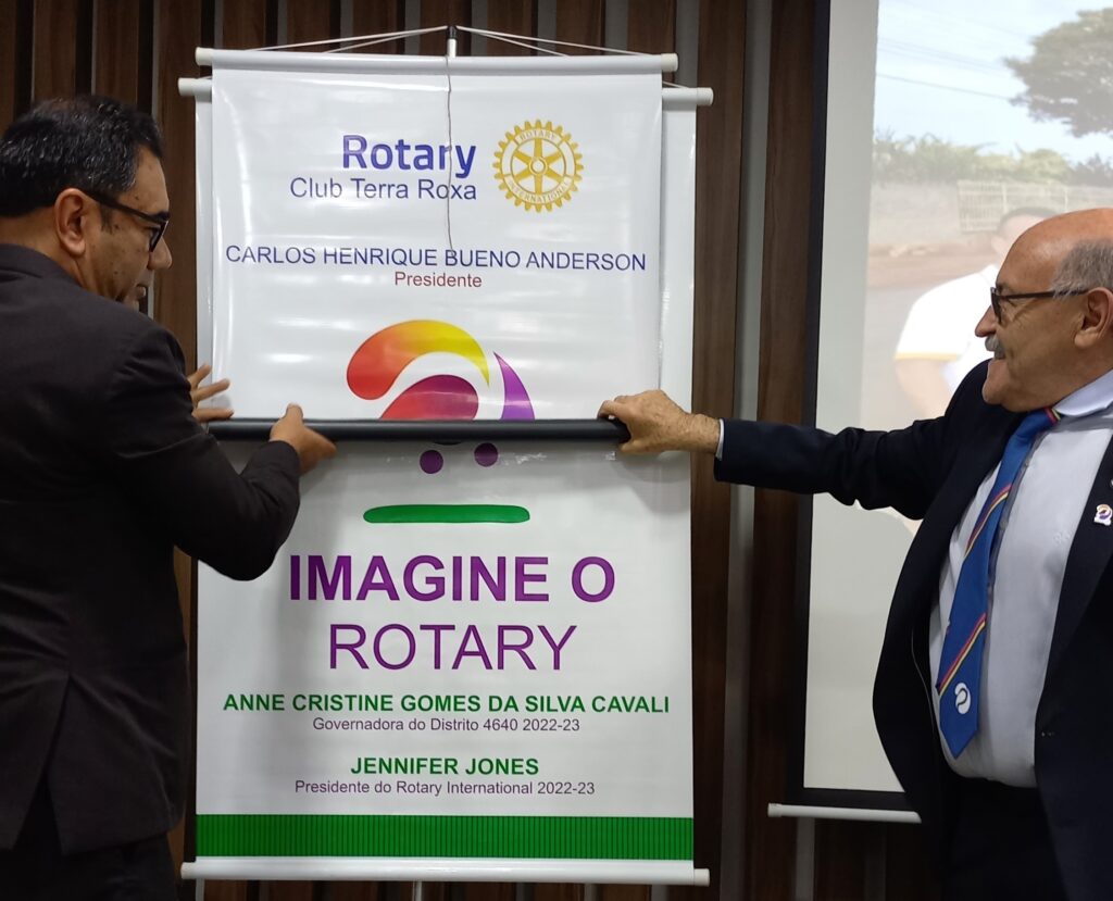 Em ato continuo o Governador do distrito 4640 do Rotary Club Internacional, Companheiro Antônio da Caz, juntamente com o presidente entrante do Rotary Clube Terra Roxa, Carlos Henrique desçam a flâmula Rotária.