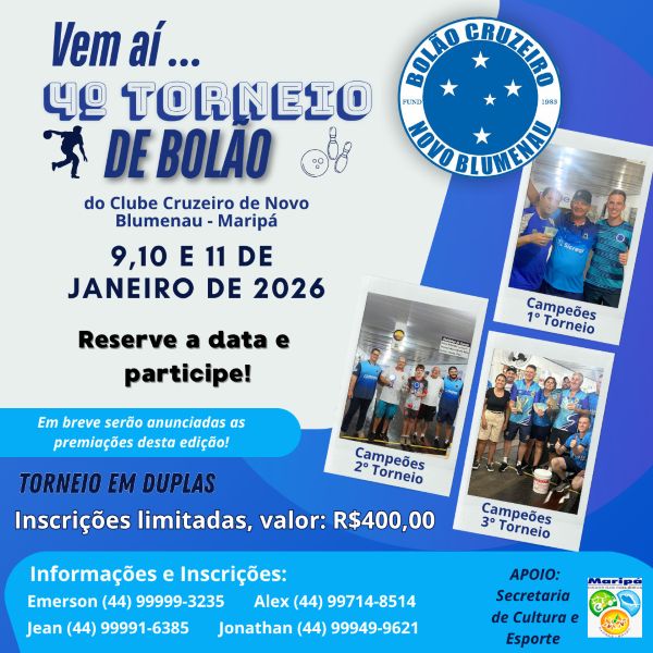 O Clube Cruzeiro, de Novo Blumenau – Maripá, promove o 4º Torneio de Bolão, que acontecerá nos dias 9, 10 e 11 de janeiro de 2026, O torneio sara na cancha da Linha Novo Blumenau município de Maripá