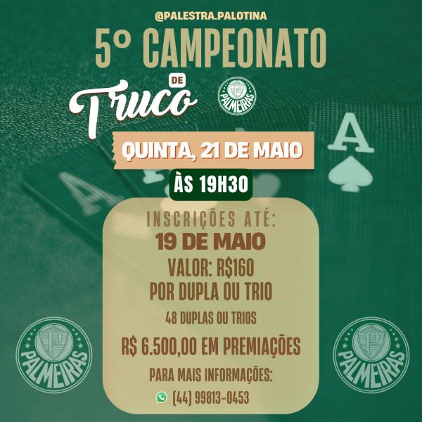O Consulado da Sociedade Esportiva Palmeiras em Palotina está organizando o 5º Campeonato de Truco, que promete reunir competidores e amantes do jogo em uma noite de muita disputa e integração.