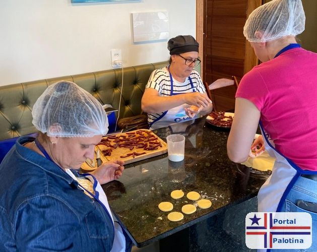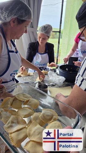 Durante a aula, foram ensinadas técnicas de preparo de massas frescas, como tortellini, rondelli e canelone, além de biscoitos artesanais, incluindo bolachas de manteiga natalinas, cookies e petit four de goiabada.