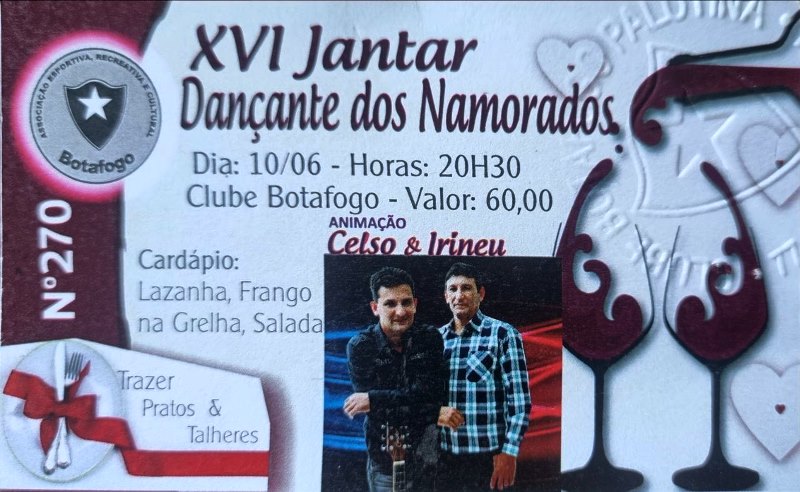Acontece no dia 10/06 a XVI edição do tradicional Jantar Dançante dos Namorados organizado pelo Clube Botafogo.