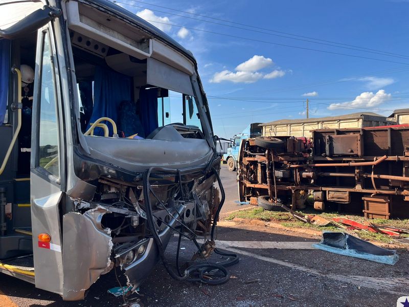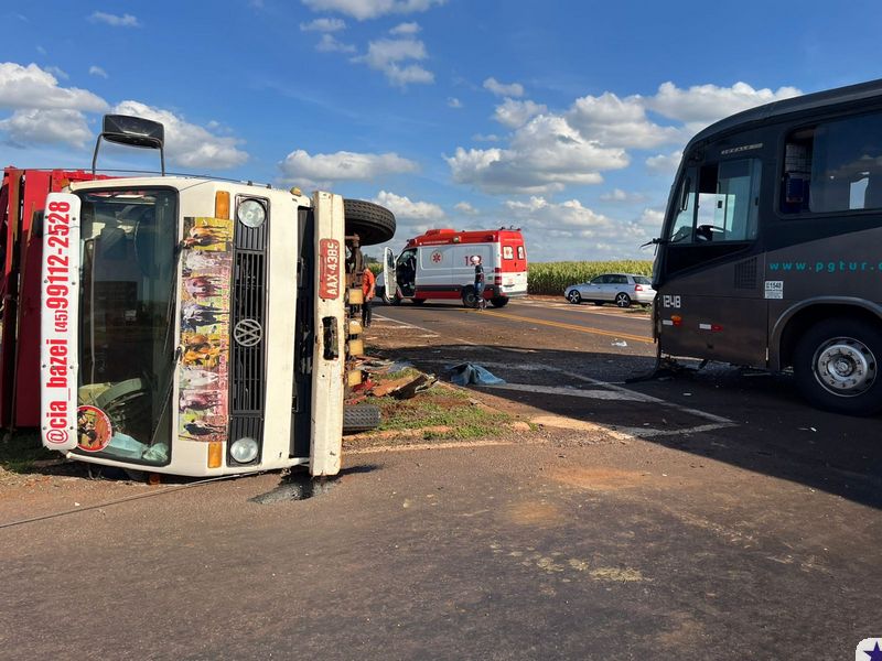 Um grave acidente foi registrado na tarde desta sexta-feira (16) no trevo da PR-182, em Maripá, que dá acesso a Nova Santa Rosa, Palotina e Toledo. A colisão envolveu um ônibus com trabalhadores e um caminhão boiadeiro com placas de Itaipulândia.