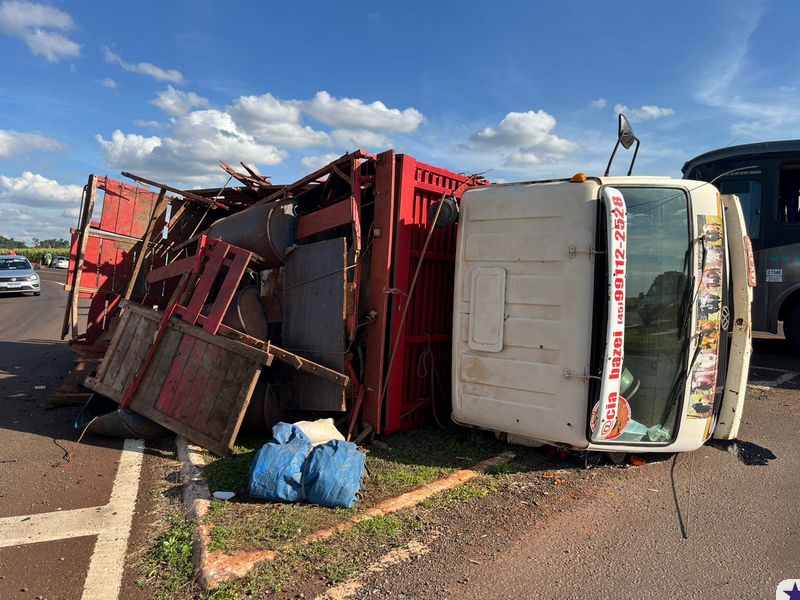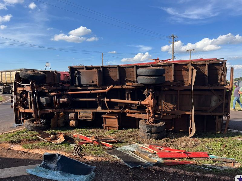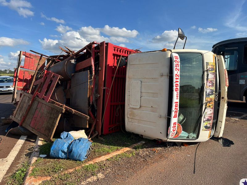 Com o impacto, o caminhão tombou e ficou de lado, enquanto o ônibus permaneceu parado na pista. O trânsito precisou ser desviado pelas laterais do trevo, gerando grande movimentação no local.