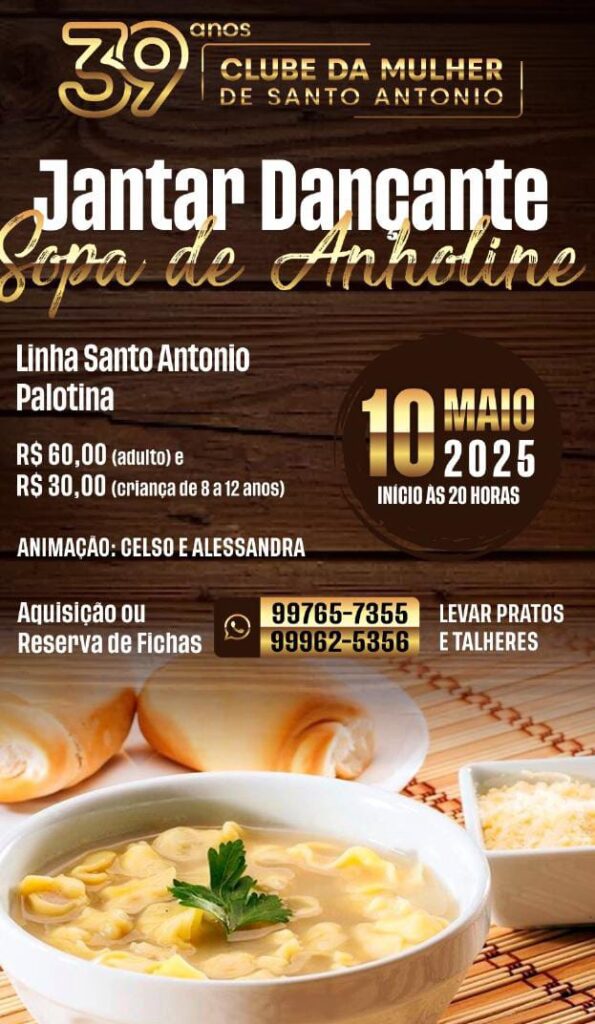 O Clube de Mulheres de Linha Santo Antônio, interior de Palotina promoverá no dia 10/05, o tradicional Jantar Dançante em comemoração aos 39 anos de existência.