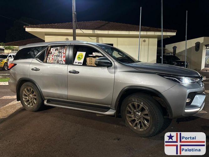 Durante a verificação do interior da Hilux, os policiais localizaram uma grande quantidade de cigarros de origem estrangeira. Na vistoria realizada posteriormente no 31º BPM, foi constatado que a placa utilizada não correspondia ao veículo, evidenciando adulteração dos sinais identificadores.