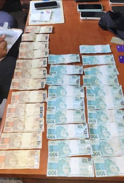 Parte do dinheiro falso foi localizada com um dos abordados, enquanto o restante foi encontrado no interior do automóvel. Após a abordagem, os envolvidos foram encaminhados à unidade policial, onde, já na delegacia, também foi apreendido o dinheiro verdadeiro que estava em posse do grupo.
