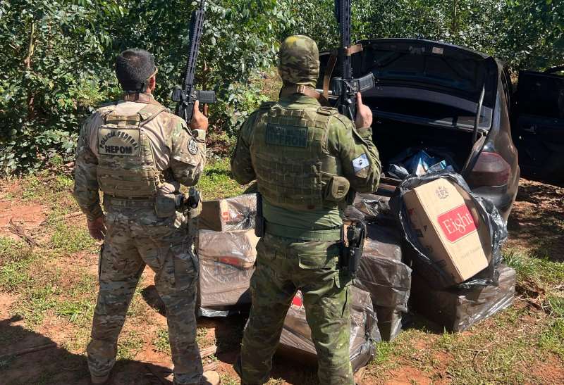 Realizando diligências nas proximidades, foi possível localizar abandonados em uma plantação de eucalipto um veículo GM/Prisma e um veículo VW/Gol, ambos carregados com 2.000 (dois mil) pacotes de cigarros contrabandeados do Paraguai.