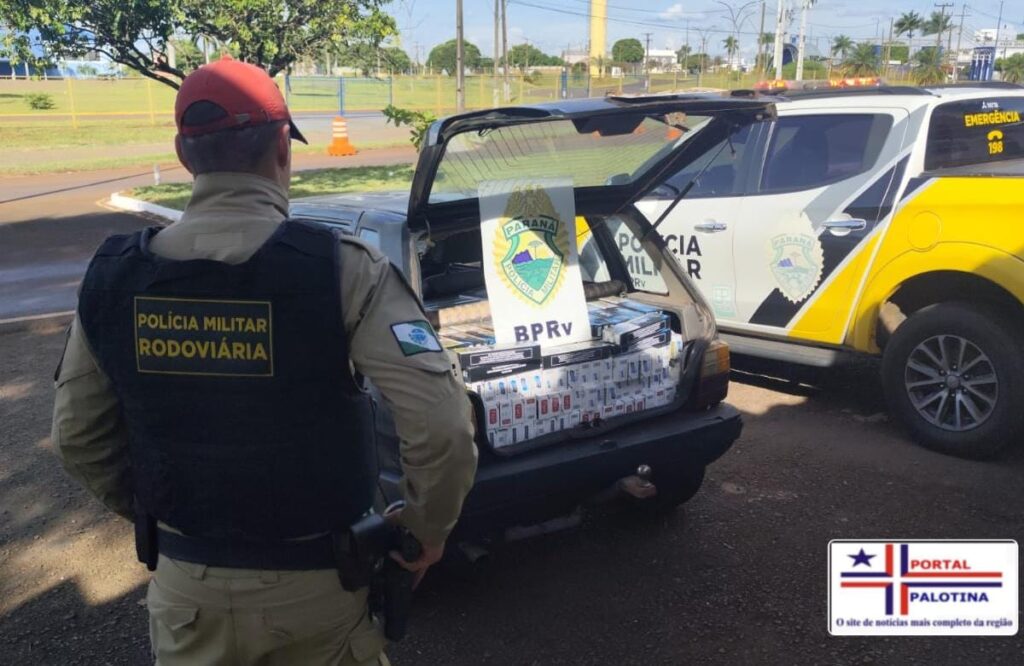 Ao vistoriar o veículo, os policiais encontraram aproximadamente 20 caixas de cigarros contrabandeados do Paraguai, das marcas San Marino, Eight e Fox.
