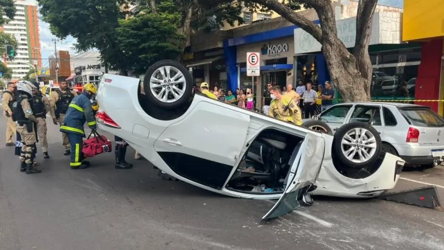 De acordo com informações apuradas no local, um Toyota/Corolla seguia sentido praça quando colidiu com uma VW/Amarok que saía de uma vaga de estacionamento. Com o impacto, o Corolla capotou sobre a via.