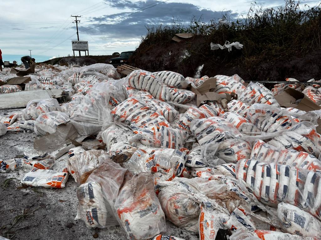 A grade baixa estourou e toda a carga caiu ficando na pista e nas margens da pista.
