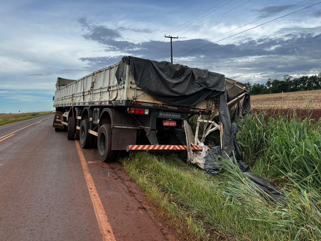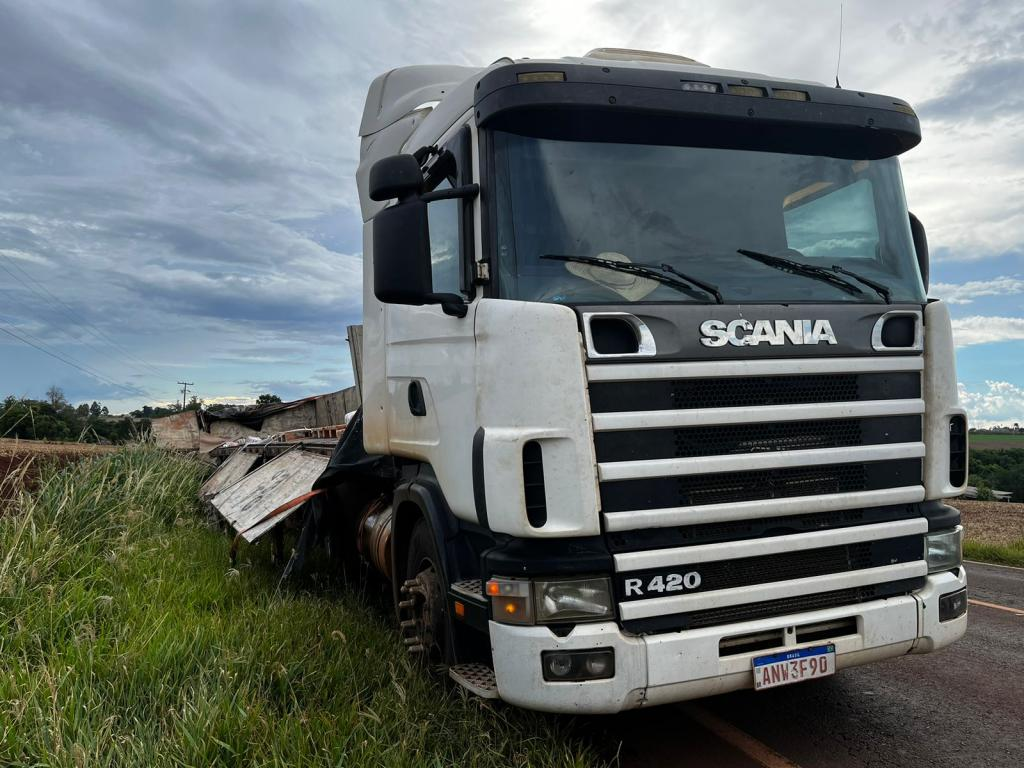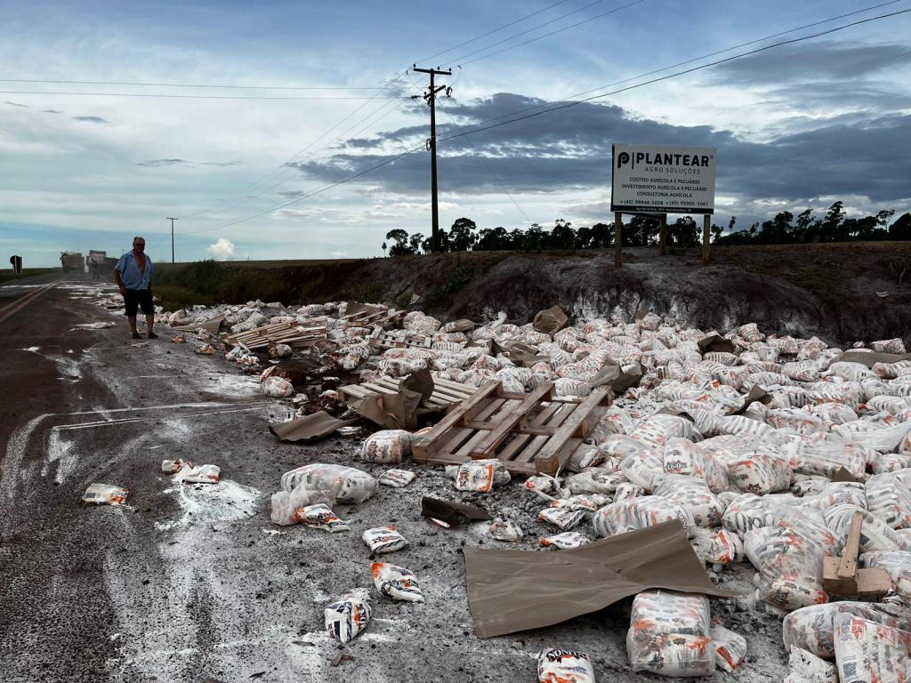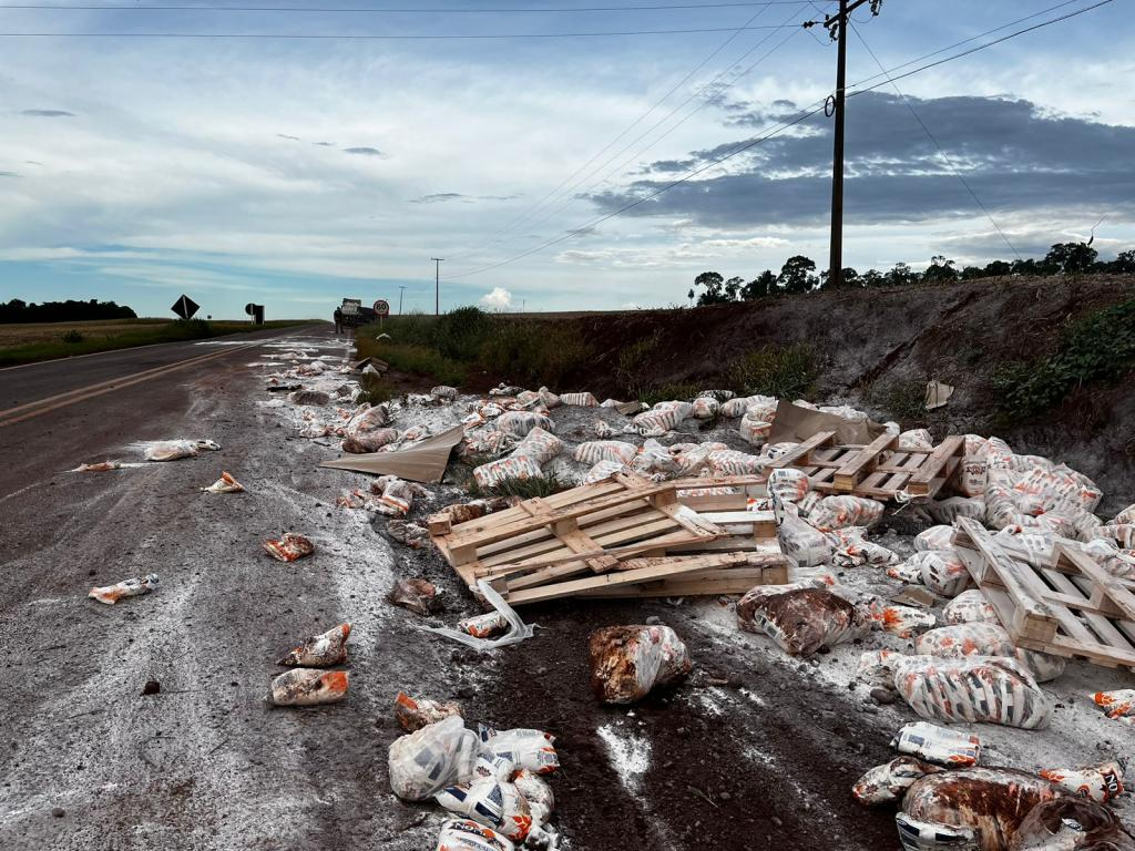 Um cavalo mecânico da marca Scania com placas Mercosul, conduzido por um homem de aproximadamente 50 anos, carregado com 31 toneladas de farinha de trigo tombou na rodovia PR 491 em Nova Santa Rosa logo após a ponte da Sanga Xerê sentido a Maripá no final da tarde desta terça-feira.