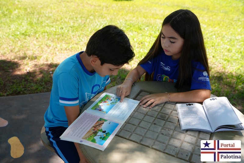 Júlia auxilia Caleb na leitura: alunos mais velhos orientam os de séries anteriores