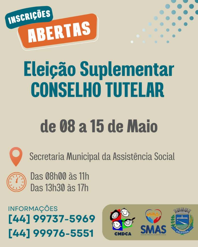 Estão abertas, até o dia 15, as inscrições para a Eleição Suplementar do Conselho Tutelar de Palotina. Os interessados em participar do processo seletivo para o cargo de conselheiro(a) tutelar devem se inscrever na Secretaria Municipal de Assistência Social, no horário das 8h às 11h e das 13h30 às 17h.