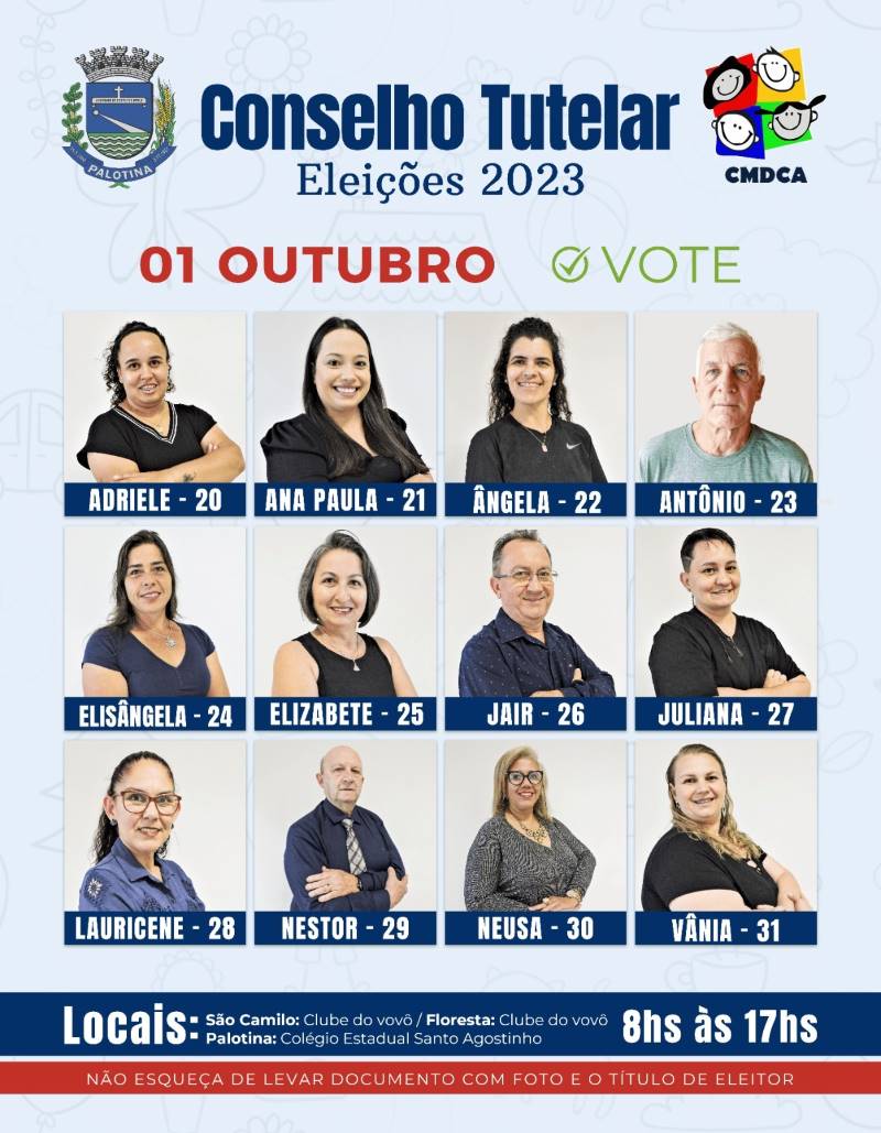 No próximo domingo, dia 1º de outubro, Palotina se prepara para um importante evento democrático: as eleições para o Conselho Tutelar. Doze candidatos estão na disputa pelas vagas disponíveis. O pleito ocorrerá no Colégio Estadual Santo Agostinho, e nos clubes do Vovôs nos Distritos de São Camilo e Vila Floresta.