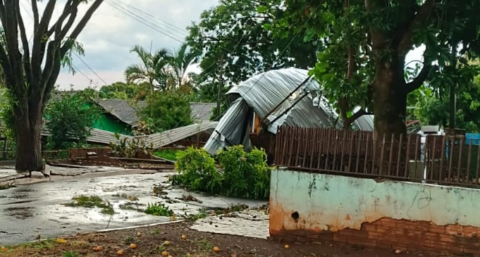 Uma residência foi destelhada em decorrência das rajadas intensas. Parte de um portão de ferro também caiu devido à força do vento.