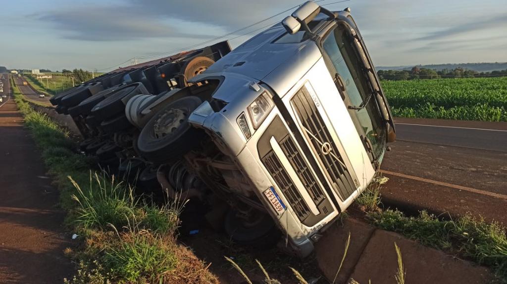 De acordo com informações da Polícia Rodoviária Federal (PRF), o caminhão Volvo com placa Mercosul, carregado com areia, trafegava no sentido Toledo, quando o motorista perdeu o controle da direção e o veículo tombou no canteiro central da rodovia.