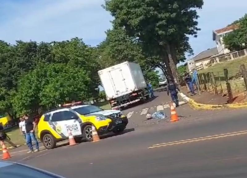 A colisão envolveu uma motocicleta Kenton, com placas paraguaias e um caminhão baú.
