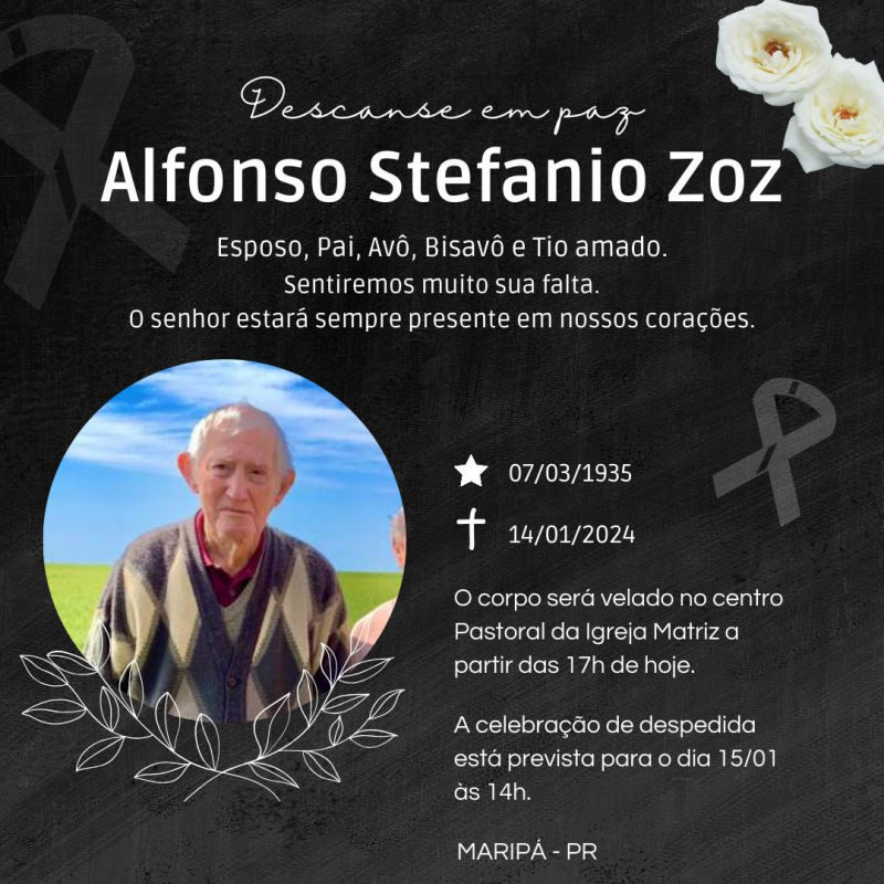 A Funerária Bom Jesus comunica com pesar o falecimento do Sr. Alfonso Stefanio Zoz, ocorrido hoje, aos 88 anos de idade.