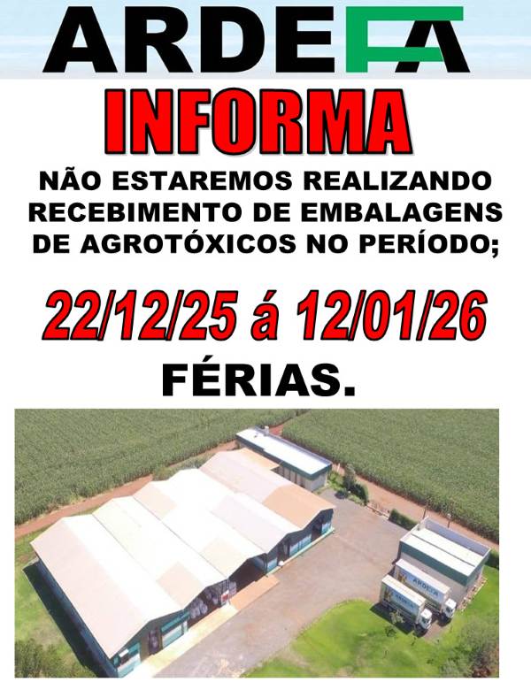 As férias serão entre os dias 22/12/2025 a 12/01/2026, e neste período não estarão recebendo embalagens.
