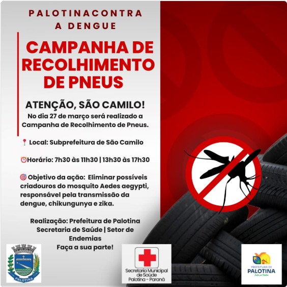 A Secretaria de Saúde, por meio da Vigilância em Endemias, convida toda a população para participar da Campanha de Recolhimento de Pneus, uma ação fundamental no combate ao mosquito da dengue.