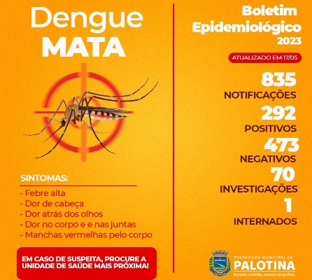 O boletim Epidemiológico divulgado pela a equipe da Secretaria Municipal de Saúde de Palotina revela que o município teve 835 notificações, sendo 70 investigações, 473 casos negativos e 292 casos positivos e 01 palotinense está internadoa devidos complicações da Dengue.