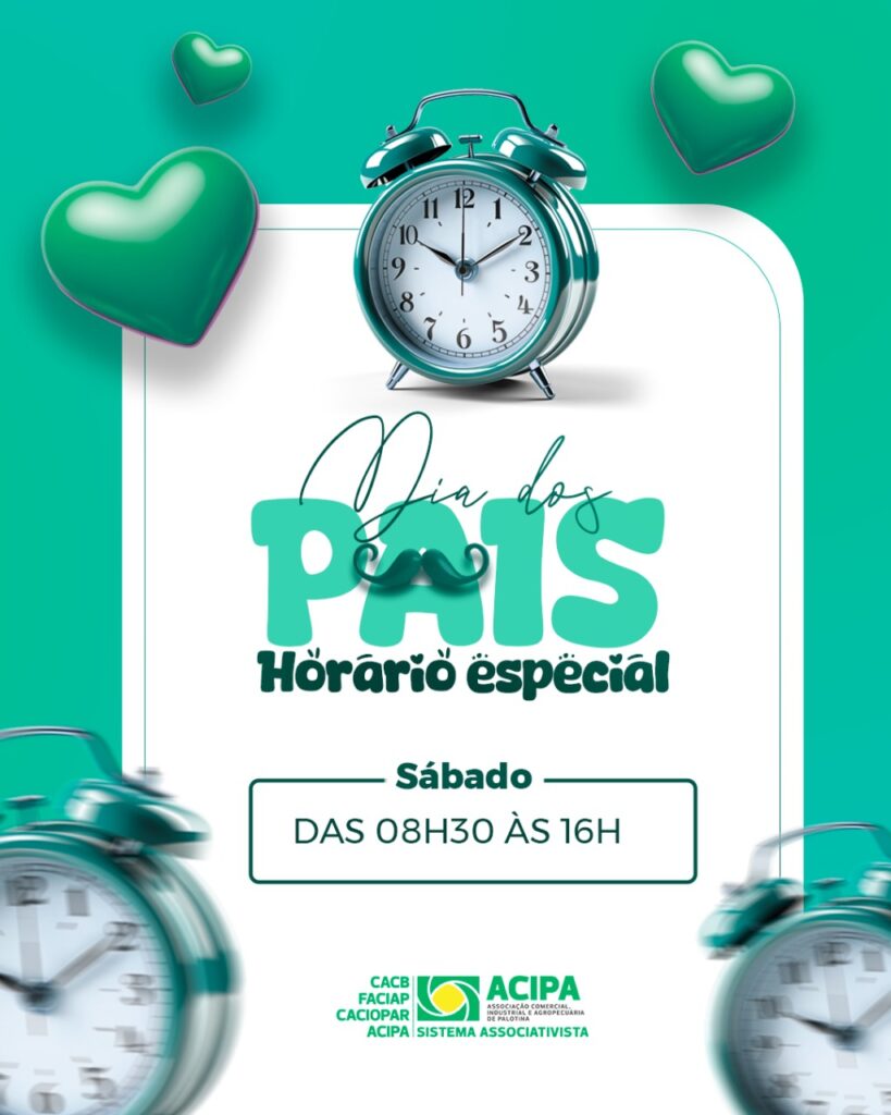 A Acipa informa que no sábado, dia 12 de Agosto, o comércio estará com horário especial. Aproveite para fazer as suas compras e presentear seu papai. 12 de agosto 8h30 às 16h00