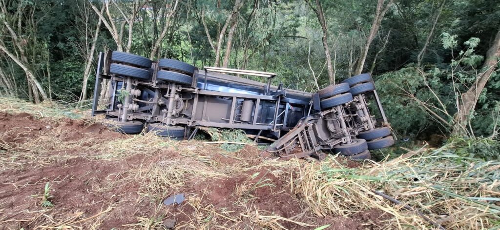 Palotina: Semirreboque de bitrem se desacopla e tomba após ultrapassagem imprudente